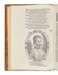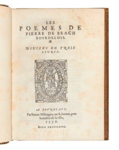 Pierre de BRACH. Les Poemes… divisés en trois livres. In-4, maroquin rouge avec décor dans le genre Du Seuil, dos à six nerfs joliment orné, roulette dorée sur les coupes, roulette intérieure, tranches dorées sur marbrure ( Niedrée). Brunet, I-1196 // De Backer, 516 // Tchemerzine-Scheler, II-106. (8 f.)-220 f.-(2 f.) / ã4, ē4, A-Iii4, Kkk2 / 149 x 215 mm. Édition originale très rare. Jurisconsulte bordelais, Pierre de Brach (1549-1605) fut proche de Montaigne, Du Bartas et Pelletier du Mans. Viollet-Le-Duc parle de lui comme d’un versificateur élégant et harmonieux, bien supérieur sous ce rapport à tous les poètes ses contemporains et regrette qu’il soit souvent cantonné aux poètes patois, son œuvre ne comptant que 24 vers gascons parmi des milliers de vers français. On trouve dans ses poèmes un long hymne à Bordeaux, des élégies et des odes diverses ainsi qu’un Voyage en Gascogne. Cette édition est ornée d’un portrait gravé par Thomas de Leu. Manque les feuillets D2 et D3, cahier Iii en fac-similé. Petites taches à la reliure, quelques pâles rousseurs, f. ã3 déchiré en marge. Provenance: Al. Gayanis (? ex-libris manuscrit ancien partiellement effacé).