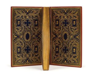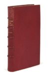 Guillaume COQUILLART. Les Œuvres maistre Guillaume Coquillart en son vivant Official de Reims nouvellement reveues… Petit in-8, maroquin janséniste rouge, dos à 5 nerfs, doublure de maroquin bleu avec grand décor à la fanfare aux filets, branches foliacées et fleurons dorés, doubles gardes, tranches dorées sur marbrure ( Trautz-Bauzonnet). Brunet, II-266 // De Backer, 175 // Tchemerzine-Scheler, II-512-513. 156 f. (mal chiffrés 158) / a-t8, u4 / 72 x 130 mm. Première et précieuse édition en lettres rondes, très recherchée. Né à Reims vers 1450, Guillaume Coquillart étudia le droit à Paris où il exerça comme avocat. Lassé de cette ville dans laquelle il observa l’injustice et la partialité des grands en même temps qu’il connut les tourments de l’amour, il revint à Reims où il se consacra à la charge de juge ecclésiastique. Œuvres nouvellement reveues dans laquelle le texte a été un peu retouché. Il y manque les petites pièces politiques écrites par Coquillart, mais on y trouve pour la première fois le Monologue du Pays et le Monologue du gendarme cassé. Sont donc réunis ici, Les droitz nouveaulx, Le Plaidoier, l’Enqueste dentre la simple & la Rusée, Le Blason des armes et des dames, Le monologue de la botte de foing, ainsi que les monologues du Puys, du gendarme cassé et des Perruques. Très bel exemplaire dans une reliure doublée de Trautz-Bauzonnet.