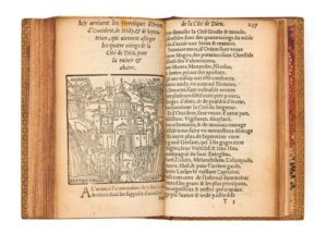 Artus DÉSIRÉ. Les Combatz du fidelle chrestien, dit papiste, contre l’infidelle apostat antipapiste…, le tout composé par Artus Désiré. In-16, veau blond, double filet, dos à 4 nerfs orné ( Reliure de la première moitié du XIXe siècle). Baudrier, IV-384 // Brunet, II-628 // Cioranescu, 7586. 166 f. (mal chiffrés 165) / A-V8, X6 / 68 x 112 mm. Nouvelle édition. Né vers 1510 et mort en 1579, Artus Désiré, prêtre normand, passa ses loisirs, sinon sa vie, à écrire contre le calvinisme, convaincu qu’il était que la religion catholique était en péril. Son ardeur proche du fanatisme le porta même à conspirer contre sa patrie en appelant Philippe II roi d’Espagne au secours de la religion catholique française, ce qui lui valut une amende et cinq années d’enfermement dans un couvent de chartreux. Les Combatz du fidèlle chrétien, dit papiste contre l’infidèle apostat antipapiste est un dialogue de plus de 7.000 lignes rimées entre le papiste et l’antipapiste au milieu duquel viennent se placer nombre de citations des Écritures et des pères de l’église. La première parution de ce texte fut publiée en 1550 à Rouen chez Robert et Jehan Du Gort. Plusieurs éditions sont citées par Brunet et Cioranescu. Celle-ci serait la quatrième. Elle varie de la première en ce que le mot antipapiste a remplacé le mot d’origine priapiste. Elle est ornée de 27 petits bois gravés dans le texte. Dos passé. Exemplaire court de marges avec atteinte aux marginalia imprimés, quelques feuillets tachés.