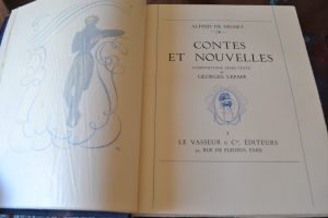 Musset (Alfred de) & Lepape (Georges) - Contes et nouvelles. Paris Le Vasseur, 1937. 10 vol. in8 demi basane bleue, dos à nerfs ornés, sous étui, couv., conservées ,144 compositions en couleurs hors-texte de Georges Lepape. Un des ex. sur Rives....