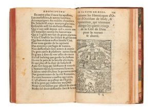 Artus DÉSIRÉ. Les Batailles et victoires du chevalier Celeste, contre le chevalier Terrestre, l’un tirant à la maison de Dieu, & l’autre à la maison du Prince du monde chef de l’Eglise maligne… Petit in-8, veau marbré, triple filet, dos lisse orné ( Reliure du XVIIIe siècle). Brunet, II-628 // Cioranescu, 7587 // De Backer, 363. 175 f. (sur 176, le dernier blanc manquant ici) / A-Y8 / 70 x 112 mm. Nouvelle édition de ce poème de plus de 7.000 vers, que l’auteur avait d’abord publié sous le titre Les Combatz du fidelle papiste pelerin romain contre l’apostat Priapiste (ou antipapiste) et qui est dirigé contre le calvinisme et ses adeptes. C’est une réimpression avec quelques changements au début du poème. Les noms des interlocuteurs ont été changés et s’appellent à présent le chevalier Céleste et le chevalier Terrestre. La première édition sous ce titre parut en 1553. L’édition que nous présentons est illustrée de 29 petits bois gravés dans le texte. Petits manques aux coiffes et aux charnières, titre et 3 derniers feuillets réparés dans les marges, manque angulaire à un feuillet dû à la taille initiale de la feuille. Le couteau du relieur a un peu rogné, sur 1 ou 2 feuillets, les marginalia imprimés.