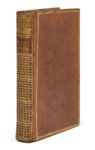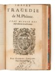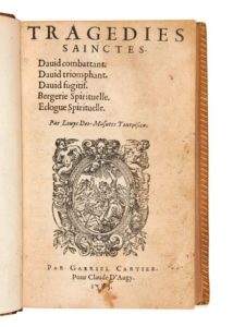 Louis DES MASURES. Tragedies sainctes… – [Louis DES MASURES]. PHILONE. Iosias, tragédie. Ibid., id., 1583. 2 ouvrages en un volume in-8, veau blond, triple filet, dos lisse joliment orné, tranches dorées ( Reliure de la fin du XVIIIe siècle). Brunet, II-636 / IV-617 // De Backer, 367 // Cioranescu, 7662-7660. 319 / A-V8 // 104 / A-F8, G4 / 96 x 155 mm. Seconde édition et première complète des Tragédies sainctes de Louis Des Masures, poète français auteur de poésies latines, de poèmes français, d’œuvres de théâtre, de traductions de textes liturgiques comme d’auteurs classiques, etc. Une première édition avait paru en 1566 contenant David combattant, David Triomphant et David fugitif. Cette seconde édition contient en plus Bergerie spirituelle et Éclogue spirituelle. Les passages pour les chœurs, qui sont généralement des psaumes, sont ici imprimés avec leur musique notée. Le second ouvrage est en seconde édition. Les deux ouvrages portent sur le titre la marque de l’imprimeur. Exemplaire court de marges avec des taches à plusieurs feuillets, titres salis.