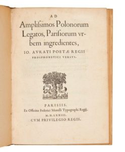 Jean DORAT. Ad Amplissimos Polonorum Legatos, Parisiorum urbem ingredientes… Plaquette in-4, …