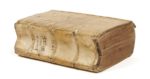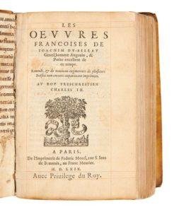 Joachim DU BELLAY. Les Œuvres françoises. 8 parties en un fort volume in-8, vélin à recouvrements anciennement doré, tranches dorées ( Reliure de l'époque). Brunet, I-749 // Cioranescu, 8280 // Tchemerzine-Scheler, III-75 (12 f.) / a8, b4 // I. 40 f. / A-E8 // II. 80 f. / A-K8 // III. 96 f. / A-M8 // IV. 88 f. / A-L8 // V. 60 f. / A-G8, H4// VI. 64 f. / A-H8 // VII. 80 f. / A-K8 // VIII. 72 f. / A-I8 / 107 x 165 mm Troisième édition des œuvres de Joachim Du Bellay. Elle est une réunion factice d’œuvres déjà publiées chez Federic Morel et réunies sous un titre général. Elle est formée des huit parties suivantes: La Defense et illustration de la langue françoise. – L’Olive et autres œuvres poétiques. – Recueil de poésie présenté à… Madame Marguerite. – Deux livres de l’Enéide… – Divers poèmes. – Les Regrets et autres œuvres poétiques. – Divers jeux rustiques et autres œuvres poétiques. – Epithalame sur le mariage de… Philibert Emanuel duc de Savoie… Ces parties possèdent toutes un titre séparé à l’adresse de Morel et à la date de 1568 sauf pour la Defense et illustration de la langue françoise qui est à la date de 1569. Elles sont à pagination séparée. Ces huit parties sont précédées d’un titre général à l’adresse de Federic Morel, daté 1569, suivi de 11 feuillets pour le privilège, la dédicace et la table. Exemplaire réglé dans un vélin du temps qui s’est fripé et dont l’or est effacé. Quelques annotations manuscrites anciennes et quelques passages soulignés.