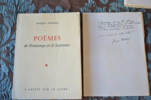 Nanteuil, (Jacques) - Poèmes de Printemps et d'Automne. Blainville sur mer, L'amitié par le livre, s.d . In12, broché, 79 pp. llustrations de Mme Besnard-Giraudias ex. n°13 signé par l'auteur sur pur fil lafuma contenant quelques vers de la main...