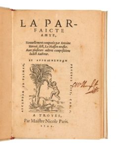 Antoine HEROET, dict La Maison neuve. La Parfaicte amye… In-8, vélin à recouvrements, dos lisse ( Pagnant). Tchemerzine-Scheler, III-691. 96 / A-F8 / 95 x 140 mm. Seconde édition faite d’après la première publiée chez Étienne Dolet la même année. L’auteur, poète français du milieu du XVIe siècle, embrassa la carrière ecclésiastique et devint évêque de Digne en 1552. Ce prélat fut aussi connu de son temps pour son activité poétique et il jouit à son époque d’une assez grande réputation. La Parfaicte amye est son œuvre maîtresse. Antoine Heroet y sublime l’amour humain en le faisant participer de l’amour divin. L’amour de la parfaicte amye est dégagée de toute pensée sensuelle. Elle n’a qu’un ami, qui n’est point beau; cet ami meurt et, sans s’en désoler, elle ne l’aime pas moins, seulement elle attend que la mort la réunisse à lui (Viollet-Le-Duc). Cette conception de l’amour était opposée à celle, beaucoup moins spirituelle, mais plus amusante, développée dans l’Amye de Court du sieur La Borderie, amye très positive et fort coquette… Cette querelle des deux amours eut un retentissement prodigieux et fut la cause de la publication de nombreux poèmes. Ex-libris manuscrit sur le titre.