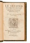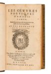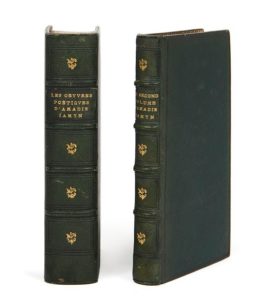 Amadis JAMYN. Les Œuvres poétiques. Reveües, corrigees & augmentees en ceste derniere impression. – Le Second volume des œuvres… Ibid., Félix Le Mangnier, 1584. 2 volumes in-12, chagrin bleu canard, double filet à froid, dos à 4 nerfs orné de même avec fleurons dorés, roulette intérieure, tranches dorées ( Reliure du XIXe siècle). Brunet, III-497 // Cioranescu, 11774, 11775 // De Backer, 406/407 // Tchemerzine-Scheler, III-740,741. I. (4 f.)-309-(11 f.) / *4, A-Z12, a-c12, d8 / 73 x 132 mm. // II. (6 f.) le dernier blanc manquant ici-176 (mal chiffré 182)-(4 f.) / ā6, A-P12 / 70 x 126 mm. Troisième édition, en partie originale, pour les Œuvres poétiques, et originale pour Le Second volume des œuvres. Bien que publiées à cinq ans de distance, toutes les bibliographies consultées indiquent qu’il faut réunir ces deux éditions pour faire un exemplaire complet des œuvres d’Amadis Jamyn. Le second volume n’a pas été réimprimé et il est donc plus rare de le rencontrer. On trouve des exemplaires du premier volume à l’adresse de Mamert Patisson ou de Le Mangnier. Il est donc probable qu’ils se soient partagé l’édition. Le second volume offre une particularité. Le feuillet 129 est un titre général au Discours de la philosophie à passicharis et à Rodanthe qui correspond à la description qu’en a faite De Backer. Il est suivi par un feuillet qui contient le privilège au recto et un sonnet introduisant les Discours philosophiques au verso. Ce feuillet n’a pas de signature et est ajouté au cahier L. Les volumes ont une petite différence de taille que le relieur a habilement homogénéisée à la reliure. Taches d’encre à 4 feuillets dans le premier volume, quelques passages soulignés anciennement, titre du second volume réparé et petites restaurations marginales à quelques feuillets. Provenance: Prosper Blanchemain (ex-libris, catalogue Maggs Bibliothèque d’un humaniste, 1937, n° 251).