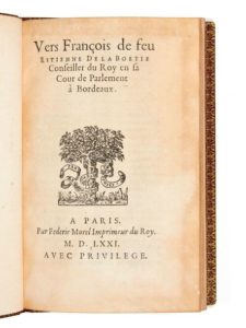 Étienne de LA BOÉTIE. Vers François de feu Estienne De La Boetie… Plaquette petit in-4, …