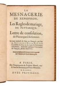 [Étienne de LA BOÉTIE]. XENOPHON. La Mesnagerie de Xenophon. Les Regles de mariage de Plutarque. Lettre de consolation de Plutarque à sa femme. In-8, veau blond, dos à 5 petits nerfs orné, roulette intérieure, tranches dorées ( Thouvenin). De Backer, 326 // Tchemerzine-Scheler, III-785. 120 f. (sur 131) / A-P8 / 106 x 163 mm. Seconde édition de ces traductions qui furent publiées par Montaigne en hommage à son fidèle ami. Le volume contient quatre préfaces ou avertissements de Montaigne. Il est amputé des onze derniers feuillets devant contenir un extrait d’une lettre de Montaigne… sur la mort de La Boétie. Restaurations anciennes, hauts de mors un peu fendus.