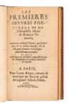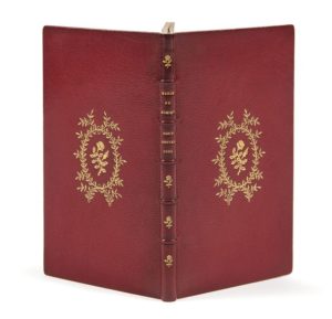 Marie de ROMIEU. Les Premières œuvres poetiques de Ma Damoiselle Marie de Romieu Vivaroise. In-12, maroquin rouge, médaillon floral doré avec branches et rose sur les plats, dos à 5 nerfs orné d’une rose répétée, dentelle intérieure, tranches dorées ( Trautz-Bauzonnet). Brunet, IV-1370 // Cioranescu, 19288 // De Backer, 371. (4 f.)-49-(1 f.) / a4, A-D12, E2 / 71 x 132 mm. Édition originale rare et seule édition des œuvres de Marie de Romieu qui furent publiées par son frère Jacques de Romieu. On sait très peu de choses sur cette femme poétesse sinon qu’elle vivait au XVIe siècle et qu’elle appartenait à une famille noble du Vivarois. La poésie de Marie de Romieu est remplie d’esprit, de grâce et de naturel (Viollet-Le-Duc) et nous ajoutons de légèreté et de finesse, mais ce n’est là qu’une des facettes de son œuvre poétique. Le volume commence en effet par un Brief discours que l’excellence de la femme surpasse celle de l’homme…, pièce pleine de charme et de naturel qu’elle écrivit en réponse à une satire contre les femmes que son frère avait rédigée. Ce dernier lui rendit hommage en réunissant ses œuvres et en les publiant après son décès. Sur sa tombe on fit graver les vers qui terminent son hymne à la rose: Celle qui gist ici sous cette froide cendre Toute sa vie aima la Rose fresche & tendre Et l’aima tellement qu’après que le trespas L’eut poussée à son gré aux ondes de là bas Voulut que son cercueil soit entouré de Roses Comme ce qu’elle aimait par-dessus toutes choses. Ravissant exemplaire dans une délicate reliure de Trautz-Bauzonnet. Provenance: Comte Raoul de Lignerolles (II, 5-17 mars 1894, n° 1002), Édouard Moura (ex-libris, 3-8 décembre 1923, n° 285) et Hector De Backer (ex-libris, 17-20 février 1926, n° 371).