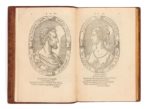 Pierre de RONSARD. Les Amours… Ensemble le cinquiesme de ses Odes. In-8, maroquin rouge, médaillon central foliacé doré sur les plats, dos à 5 nerfs orné de même, dentelle intérieure, tranches dorées ( Gruel). Barbier, MBP, II-9 // Tchemerzine-Scheler, V-418. 239-(32 f.) / a-p8, A-D8 / 105 x 166 mm. Édition originale rarissime. Pierre de Ronsard, né en 1524 près de Vendôme, est l’une des figures littéraires majeures du XVIe siècle, à l’origine, avec la brigade de poètes de la Pléiade dont il fut le chef de file, du renouveau poétique de la langue française. Doté d’une solide instruction, il fut attaché comme page à plusieurs prince dont Jacques V d’Écosse et le futur Henri II, mais, devenu sourd à 18 ans des suites d’une maladie, il abandonna la carrière diplomatique qui s’ouvrait à lui pour se consacrer à la poésie. Il étudia aux côtés de Baïf sous l’enseignement de Jean Dorat et inspira Du Bellay pour son manifeste Defense et illustration de la langue françoise. Tombé amoureux d’une jeune fille qu’il nomme Cassandre, il composa pour elle de nombreux sonnets. Couvert d’éloges, loué comme le chef d’une nouvelle école insufflant de la variété, de l’éclat et de nouveaux rythmes à la poésie, il réunit autour de lui, sous le nom de Pléiade, Baïf, Du Bellay, Thyard, Jodelle, Belleau, Dorat et Pelletier Du Mans. Il mourut en 1585. Le recueil des Amours est composé de 184 sonnets inspirés par son amour pour Cassandre, que suivent le cinquième livre des Odes et les Bacchanales, relation versifiée d’une excursion que Dorat fit avec ses élèves à Arcueil. Les 32 derniers feuillets contiennent des airs de musique notée, composés par Pierre Certon, Claude Goudimel, Marc-Antoine de Muret et Clément Janequin. L’édition est ornée des portraits à l’antique de Ronsard et Cassandre se faisant face et surmontant des vers de Baïf. C’est ici la première fois que ces portraits paraissent. Très bel exemplaire. Cahier D restauré en pied et dans la marge intérieure.
