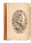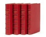 Pierre de RONSARD. Les Œuvres… 5 parties en 4 volumes in-16, maroquin janséniste rouge, dos à 5 nerfs, dentelle intérieure, tranches dorées sur marbrure ( M. Lortic). Barbier, MBP, II-28 // Tchemerzine, V-474 et s. I. (12 f.)-140f.-91 f.-(5 f.) / a8, e8, a-r8, s4, A-M8 // II. (8 f.)-249 f.-(1 f.) / *8, a-z8, A-H8, I2 // III. 222 f.-(2 f.) / A-Z8, Aa-Ee8 // IV. 135 f.-(1 f.) / A-R8 / 64 x 115 mm. Première édition collective, en partie originale, d’une extrême rareté. Elle est composée de cinq parties avec titres et paginations séparés. Le premier & le second livres des Amours (tome I), les Odes (tome II), les Poèmes (tome III) et les Hymnes (tome IV). Elle est illustrée d’un portrait en médaillon de Ronsard, reproduit dans les quatre volumes, et d’un portrait de Marc-Antoine Muret (tome I), tous deux gravés d’après Jean Cousin. C’est le premier ouvrage de Ronsard publié par Gabriel Buon, qui venait de racheter en 1558 le fonds des Laporte. Il marque le début d’une longue collaboration entre le poète et l’éditeur à qui Ronsard accorda l’exclusivité de la publication de toutes ses œuvres pour six ans. Cette édition est doublement importante en ce qu’elle contient quatre-vingts pièces inédites et en ce qu’elle offre le texte primitif des poèmes, Ronsard en ayant modifié de nombreux vers dans les éditions postérieures, pour des questions de religion. L’exemplaire provient de la collection De Backer. Nous l’avons comparé avec l’exemplaire Barbier-Mueller et avons noté une différence dans le titre du Second livre des Amours, mais notre titre est conforme à celui décrit par Tchemerzine et à celui de la BnF. Sans doute existe-t-il deux états de ce titre. La notice du catalogue De Backer insiste sur la préciosité de cette édition et la qualifie d’ une rareté extraordinaire. Il en donne une parfaite description technique et précise: on ne connait pas plus de trois exemplaires de ces précieux volumes dont un incomplet de plusieurs feuillets, celui de la Bibliothèque nationale et celui-ci. Barbier-Mueller quant à lui ne recense que deux exemplaires complets, le sien et celui de la BnF, et cite trois exemplaires incomplets qu’il a repérés, ceux des collections De Backer, Maggs et Rowfant. Ce dernier est aujourd’hui conservé à la Houghton Library de Harvard et l’exemplaire Maggs n’est pas localisé. Reste l’exemplaire De Backer que nous proposons. Il contient deux feuillets refaits au tome II, le titre (*1) et le dernier feuillet de table (*8), conditions qui en font sans doute l’un des plus complets en mains privés et l’un des seuls que l’on puisse trouver. Accroc à un volume et cire blanche en pied des volumes. Mention de tomaison du titre du tome III découpée et remplacée par une pièce de papier vierge, titre et un feuillet du tome II refaits. Les marges supérieures du tome I et latérales du tomes IV sont un peu courtes avec atteintes à quelques marginalia. Provenance: Hector De Backer (ex-libris, 17-20 février 1926, n° 396).