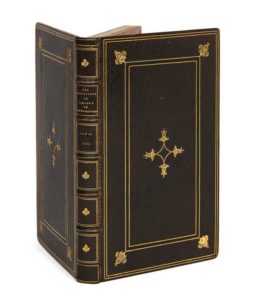 Scévole de SAINTE-MARTHE. Les Premières œuvres…, Qui contiennent ses Imitations & Traductions recueillies de divers Poëtes Grecs & Latins. Le tout divisé en quatre Livres… Petit in-8, maroquin ébène avec décor dans le genre Du Seuil, double encadrement de filets dorés et à froid, fers angulaires azurés et motif central, dos à 5 nerfs orné de petites feuilles et filets dorés, dentelle intérieure, tranches dorées sur marbrure ( Cuzin). Brunet, V-63 // Tchemerzine-Scheler, V-666. (8 f.)-120f. / A-Q8 / 86 x 151 mm. Édition originale de 1569, remise en vente en 1571 avec un nouveau titre. Ces premières œuvres sont composées de quatre livres distincts contenantses Imitations & Traductions des poètes grecs et latins, des sonnets, chants, complaintes, épigrammes, élégies… en français et en latin. Bel exemplaire joliment relié par Cuzin, auquel on a ajouté un portrait de l’auteur gravé sur cuivre par Gaucher d’après Porbus. Taches au portrait.