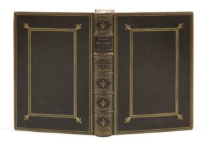 Pontus de THYARD. Les Discours philosophiques. In-4, maroquin brun, décor dans le genre Du Seuil avec fine roulette dentée ornant l’encadrement central, dos à 5 nerfs joliment orné de fleurons et rinceaux dorés, dentelle intérieure, tranches dorées sur marbrure ( Capé). Brunet, V-853 // De Backer, 514 // Tchemerzine-Scheler, V-896. (2 f. sur 4, dont un portrait et un probablement blanc manquant ici)-368 f.-(12 f.) / ã4, a-z4, A-Z4, Aa-Zz4, Aaa-Zzz4, Aaaa-Cccc4 / 163 x 239 mm. Édition collective des six discours philosophiques de Pontus de Thyard. Pontus de Thyard (Thiard ou Tiard), seigneur de Bissy (1521-1605), reçut une solide éducation classique et s’adonna très jeune à la poésie. Son premier recueil poétique, Erreurs amoureuses, publié en 1549 à Lyon eut une forte influence sur les poètes de son temps et particulièrement Ronsard dont les premières poésies furent imprimées après, en 1551, et Du Bellay qui n’entra dans la carrière poétique qu’à la fin de 1550 avec la publication de l’ Olive. Les contemporains de Thyard le louèrent d’avoir retiré la poésie hors du bourbier d’ignorance et [d’avoir] servi de guide, par la publication de ce livre, à une foule de beaux esprits. Dans le même temps, Pontus de Thyard avait pris ses degrés en théologie, entra dans les ordres et se livra désormais plus particulièrement aux études philosophiques. En 1571, il fut promu évêque de Chalon-sur-Saône et produisit des ouvrages pleins d’érudition, de doctrine et de philosophie. L’édition collective réunit ici le Solitaire premier, le Solitaire second, le Mantice, le Premier curieux, le Second curieux et le Scève ou Discours du temps de l’an et de ses parties. Les trois premiers discours avaient paru entre 1552 et 1558 chez Jean de Tournes et les trois autres en 1578 chez Mamert Patisson. Le Solitaire second, consacré à la musique, est illustré d’une grande planche dépliante représentant le monocorde et de 23 schémas dans le texte (dont un dans les errata). Cette édition est également illustrée d’un portrait gravé par Thomas de Leu, qui manque ici mais que l’on a remplacé par le même portrait, volant, dont on a coupé les marges (140 x 175 mm). La collation de notre exemplaire est conforme à celle donnée par Tchemerzine et De Backer. La bibliothèque de Lyon possède un exemplaire contenant un état supplémentaire du feuillet ã3. Bel exemplaire malgré de petits frottements aux mors. Provenance: Rothon Soc. Jes. (? ex-libris manuscrit sur le titre), Albert Pascal (ex-libris) et marquis de l’Aigle (ex-libris du château de Franc-Port).