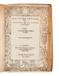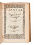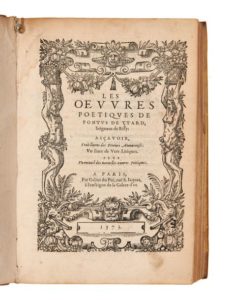 Pontus de THYARD. Les Œuvres poetiques… a sçavoir, Trois livres des Erreurs Amoureuses. Un livre de Vers Liriques. Plus Un recueil de nouvelles œuvres Poëtiques. – Mantice ou Discours de la vérité de Divination par Astrologie. Ibid., id., s. d. (1573). - Solitaire premier, ou Dialogue de la fureur poetique. Ibid., id., s. d. (1575). 3 ouvrages en un volume petit in-4, vélin crème, dos lisse ( Reliure de l'époque). De Backer, 511 // Tchemerzine-Scheler, V-893-897-898. I. (4 f.)-164-(4 f.)-(20 f.) / a-x4, y2, +4, a-e4 // II. (2 f.)-114-(1 f.) / [ ]2, a-o4, p2 // III. (2 f.)-68 (mal chiffrées 98) / [ ]2, A-H4,I2 / 145 x 218 mm. Première édition collective en partie originale des Œuvres poétiques et secondes éditions, en partie originales, de Mantice… et Solitaire premier… Les Œuvres poétiques contiennent in fine un opuscule en latin De coelestibus Asterismis Poëmatium (4f. dont une page de titre), suivi du Recueil des Nouvell’œuvres poetiques (20 feuillets), ces deux pièces en édition originale. Mantice… et Solitaire premier… sont des volumes que l’on trouve généralement à la suite des Œuvres poétiques. Ces deux pièces ayant été publiées chez le même éditeur, on peut se poser la question de savoir si elles ne font pas parties intégrantes de l’édition. Un beau titre gravé pour les Œuvres poétiques et un encadrement de titre pour Solitaire premier. Mouillures à plusieurs feuillets.
