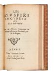 François BÉROALDE de VERVILLE. Les Apprehensions spirituelles, Poemes & autres Oeuvres Philosophiques avec les Recherches de la pierre philosophale.– Les Cognoissances necessaires, poeme contenant plusieurs belles resolutions philosophiques… – François BÉROALDE de VERVILLE. Les Souspirs amoureux. Avec un discours Satyrique de ceux qui escrivent d’Amour, par N. Le Digne. Paris, Timothee Iouan, 1584. 2 ouvrages en un volume petit in-12, maroquin rouge, triple filet à froid, dos à 5 nerfs orné de même, dentelle intérieure, tranches dorées sur marbrure ( Bauzonnet-Trautz). Brunet, I-804 // Cioranescu, 3662-3664 // Tchemerzine-Scheler, I-648-650. I. (8f.)-55f.-(2f.bl.)-(3f.)-135f.-(1f.) / a8, A-E12, A-F12, G4, H8, I-M12, N4 // II. 60f. / A-E12 // 75 x 130 mm. Second tirage de ces deux ouvrages qui ont paru pour la première fois en 1583. Seules changent ici les pages de titre qui sont à la date de 1584. Tchemerzine-Scheler cite une autre modification: dans la page de titre des Appréhensions spirituelles, on voit poeme avec, dans le second tirage, le e dans le o, remarque qui ne figure pas dans notre exemplaire. Recueil en vers et en prose pour le premier ouvrage et entièrement en vers pour le second. Philosophe et mathématicien d’une grande érudition, chanoine de la cathédrale de Saint-Gatien de Tours en 1593, François Brouart, dit Béroalde de Verville (1556-1626), reste surtout célèbre pour son incontournable Moyen de parvenir, ouvrage de contes à l’esprit peu religieux et parfois un peu licencieux. C’est oublier qu’il est aussi l’auteur de contes, de poésies et d'ouvrages sur les armoiries, les instruments mathématiques et mécaniques, la philosophie... Ses Appréhensions spirituelles et ses Soupirs amoureux sont ses premiers recueils de poésie dans lesquels on trouve des morceaux très libres [et] des obscénités dignes de figurer dans le Moyen de parvenir (Brunet). Très bel exemplaire dans une sobre reliure de Bauzonnet-Trautz. Un feuillet plus court de marge au premier volume (D6) et un trou au feuillet B12 avec perte de 2 lettres.