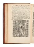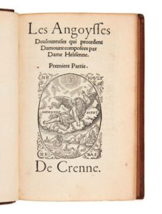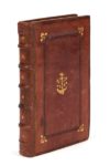 Hélisenne de CRENNE (Marguerite Briet, dite). Les Angoysses Douloureuses qui procedent Damours : composees par Dame Helisenne. Première [seconde ; tierce] Partie. De Crenne. – Ample narration faicte par Quezinstra, en regrettant la mort de son compaignon Guenelic, Et de sa Dame Helisenne après leurs deplorables fins, ce qui se declarera avec decoration du stille poetique. S. l. n. d. 4 parties en un volume petit in-8, veau caramel orné dans le genre Du Seuil avec double encadrement à froid, fleurons dorés aux angles et sénestrochère doré au centre des plats, dos à 5 nerfs orné de petites fleurettes dorées ( Reliure de l'époque). Brun, 162 // Brunet, II-414. I. (64f.) / A-H8 // II. (72f.) / AA-II8 (le dernier blanc) // III. (34f.) / AAA-DDD8, EEE2 // IV. (8f.) / a8 // 99 x 161 mm. Rare édition lyonnaise, parue probablement peu après l’originale. Exemplaire de la bibliothèque de Marcus Fugger avec son ex-libris manuscrit. On connaît peu de choses d’Hélisenne de Crenne, femme de lettres de la première moitié du XVIe siècle, à tel point qu’on a pu penser jusqu’au XIXe siècle qu’il s’agissait du pseudonyme d’un auteur masculin célèbre sans identifier lequel. On sait maintenant que Marguerite Briet, née vers 1510 en Picardie et morte vers 1560, épousa Philippe Fournel, seigneur Du Cresne, avant de s’en séparer en 1552. C’est donc sous son nom d’épouse Crenne qu’elle publia ses romans et épîtres, dont Les Angoysses douloureuses est le plus important. Paru pour la première fois à Paris en 1538, ce roman sentimental, précurseur du genre hérité des romans de chevalerie et de l’amour courtois, compte quatre parties. Il relate les aventures malheureuses d’Hélisenne, éprise du jeune Guénélic et que son époux enferme afin de la soustraire à cet amour chaste et interdit. Pour la délivrer de sa prison, Guénélic entreprend avec son ami Quézinstra un voyage qui est l’occasion de multiples aventures guerrières. Ayant retrouvé la trace de la belle, ils la délivrent et s’enfuient mais, pourchassés par la troupe, trouvent refuge dans une forêt où les deux amants malheureux rendent leur dernier soupir. Le roman se clôt par une Narration faite par Quézinstra en forme d’épilogue. Ce roman connut une très grande vogue et fut plusieurs fois réimprimé. Notre édition est probablement la seconde, l’originale ayant paru à Paris en 1538 chez Janot. Elle porte sur les trois titres la marque de l’imprimeur lyonnais Denis de Harsy, représentant Dédale et portant la devise « Ne hault. Ne bas. Mediocrement», la quatrième partie de l’ouvrage ne comportant pas de page de titre. Elle est illustrée de 4 lettrines et de 62 charmants bois gravés dans le texte (respectivement 31, 17, 12 et 2), en réalité 44 gravures dont 11 répétées. L’un des bois, répété en tête des trois premières parties, représente Hélisenne de Crenne écrivant à sa table de travail. Les autres représentent des scènes typiques de l’amour courtois (couples devisant en jouant de la musique, femme dans un château, etc.) et des romans de chevalerie (scènes de batailles, bateaux, etc.). Finement gravées, certaines de ces illustrations ont également été utilisées pour l’ Histoire du chevalier doré donnée par le même imprimeur à la même époque. Notre exemplaire provient de la bibliothèque de Marcus Fugger et porte au contreplat sa signature à l’encre Marcus Fuggerus. La reliure, faite pour ce bibliophile, est parfaitement caractéristique des reliures dites simples que contenait sa bibliothèque, en veau orné d’un double encadrement à froid, de fleurons angulaires et d’un sénestrochère central à l’oiseau. Issu d’une des plus riches familles d’Allemagne dont l’origine remonte à Jean Fugger, maître tisserand à Graben au milieu du XIVe siècle, Marcus Fugger (1529-1597), chef de la branche de Norndorf, se livra à l’étude de la science et s’occupa de la recherche de la pierre philosophale. Il fut également banquier de la ville d’Augsbourg, traduisit un ouvrage de Nicéphore Calixte et fut l’auteur d’un ouvrage sur l’élevage des chevaux. Il avait formé une bibliothèque de premier ordre. Il aimait les belles reliures et les ouvrages en langue romane, en français notamment, dont il possédait un grand nombre. C’est très vraisemblablement son petit-fils Marquart qui disposa de la bibliothèque en faveur de son beau-frère le comte Ernst d’Oettingen-Wallerstein, vers 1650. La bibliothèque resta ensuite dans cette famille. Une partie est aujourd’hui conservée à la Munich State-Library, une autre à l’Université d’Augsbourg et une troisième partie à Vienne. Une dernière partie fit l’objet de quatre ventes aux enchères à Munich de 1933 à 1935. Les ouvrages provenant de la collection Fugger sont très recherchés. Bel exempla
