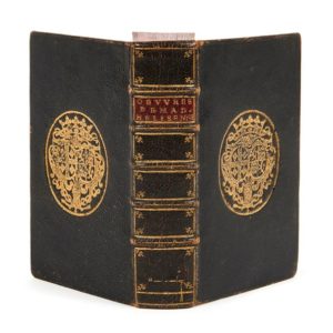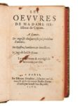 Hélisenne de CRENNE (Marguerite Briet, dite). Les Œuvres… A sçavoir, Les angoisses douloureuses qui procedent d’amours. Les Epistres familieres & invectives. Le songe de ladicte Dame. Le tout reveu & corrigé de nouveau par elle. In-16, maroquin noir, armoiries dorées au centre des plats, dos à 5 nerfs orné de petits fleurons angulaires dorés ( Reliure vers 1700). Brun, 163 // Brunet, II-415 // Cioranescu, 7102 // Olivier, 799. (175f. sur 176, le dernier blanc manquant ici) / a-z8, A-X8 / 68 x 117 mm. Sixième édition des Œuvres d’Hélisenne de Crenne, reliée aux armes de la comtesse de Verrue. Marguerite Briet, née vers 1510 en Picardie et morte vers 1560, épousa Philippe Fournel, seigneur Du Cresne, avant de s’en séparer en 1552. C’est donc sous son nom d’épouse Crenne qu’elle publia ses romans et épîtres, dont Les Angoysses douloureuses est le plus important. Les Œuvres, composées des trois principaux écrits d’Hélisenne de Crenne, à savoir Les Angoisses douloureuses, les Epistres familieres et le Songe, avaient paru pour la première fois réunies en 1543 chez Charles L’Angelier, sans illustration. Étienne Groulleau donna par la suite cinq éditions successives (1550, 1551, 1553, 1555 et la nôtre de 1560), toutes illustrées de 8 gravures sur bois dans le texte pour Les Angoisses douloureuses. Exemplaire aux armes de la Comtesse de Verrue. Jeanne-Baptiste d’Albert de Luynes naquit en 1670 et épousa le comte de Verrue en 1683. Après avoir longtemps refusé les avances du duc de Savoie Victor-Amédée II, elle devint sa maîtresse et régna sur sa cour jusqu’à sa fuite de Turin et son installation à Paris en 1700. Veuve en 1704 après le décès de son époux à la bataille de Hochstaedt, elle ouvrit son hôtel de la rue du Cherche-Midi aux gens d’esprit et aux littérateurs et réunit dans son salon la cour et les plus fins esprits du temps. Spirituelle, instruite, elle avait fait de son hôtel un vrai musée tout peuplé de tableaux, d’antiquités, d’objets d’art; tous les ans elle consacrait 100.000 livres à sa bibliothèque (Larousse). Protectrice des poètes et des philosophes, elle prodigua avec une très grande libéralité tant de divertissements, soupers et fêtes qu’ils lui valurent le surnom de Dame de volupté. Elle mourut en 1736, laissant notamment derrière elle une bibliothèque de plus de 18.000 volumes, la plupart reliés à ses armes, dont la vente eut lieu l’année suivante. Très bel exemplaire passé ensuite dans les bibliothèques Gaignat, Brunet, Marigues de Champ-Repus, Hoe et Cortlandt Bishop. Minimes frottements aux mors. Petite restauration dans la marge intérieure du titre, quelques taches d’encre aux 2 premiers feuillets et manque dans la marge supérieure du dernier feuillet. Provenance: Claude(? ex-libris manuscrit effacé sur le titre daté 1613), Comtesse de Verrue (armes, vente en 1737, n° 253), Louis-Jean Gaignat (? mention manuscrite in fine, 10 avril 1769, n° 2501, sans mention des armoiries), Jacques-Charles Brunet (20-24 avril 1868, n° 540), Eugène Marigues de Champ-Repus (ex-libris), Robert Hoe (ex-libris, II, 8 janvier 1912, n° 933) et Cortlandt F. Bischop (ex-libris, I, 5-8 avril 1938, n° 519).