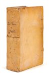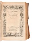 [Guillaume DU VAIR]. Traictez philosophiques par le Sr D. V. Pr. Pr. au Parl. De Pr. – [Guillaume DU VAIR]. De l’eloquence francoise, et des raisons pourquoy elle est demeuree si basse. Ibid, id., 1607. Ensemble 2 ouvrages en un volume in-8, vélin à recouvrements, dos lisse avec le titre à l’encre, traces de cordons ( Reliure de l’époque). Barbier, IV-814 // Brunet, II-926 // Cioranescu, 9318-9325 // Quérard, I-1195. I. (2f.)-144-196 / [ ]2, a-i8, A-M8, N2 // II. (2f.)-438 / [ ]2, a-z8, aa-dd8, e4 (le dernier blanc) / 119 x 189 mm. Seconde édition pour le premier ouvrage, non citée par les bibliographies, et nouvelle édition pour le second ouvrage. Moraliste, juriste et homme politique français, Guillaume Du Vair (1556-1621) fit sa carrière dans la magistrature dans le même temps qu’il mena une carrière ecclésiastique. Il fut conseiller au Parlement de Paris, Président du Parlement de Provence, Garde des Sceaux et reçut à la fin de sa vie le titre de comte et l’évêché de Lisieux. Il laissa la réputation d’un magistrat intègre, de grande capacité et de grande vertu, mais surtout celle d’un grand orateur et d’un grand écrivain et il reste le plus illustre représentant de l’éloquence parlementaire au XVIe siècle. Auteur d’ouvrages de philosophie et de piété, c’est par son traité De l’éloquence française et des raisons pourquoy elle est demeure si basse qu’il reste le plus célèbre, traité dans lequel il fustige les personnes qui abusent dans leurs discours de citations grecques et latines. Les deux ouvrages ont de très beaux titres gravés avec larges encadrements à fond criblé et décors de fleurs, oiseaux, animaux…
