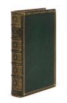[HUON.] HISTOIRE DE HUON DE BORDEAUX, pair de France & Duc de Guyenne. Contenant ces faicts, et actes heroïques, compris en deux livres. Autant beau & recreatif discours que des long temps aye este leu. Recentement reveu & corrigé. In-8, maroquin vert à long grain, triple filet, dos à 5 nerfs joliment orné aux petits fers, roulette intérieure, tranches dorées ( Koehler). Brunet, III-382. 757 (le dernier feuillet blanc manquant ici) / A-Z8, Aa-Zz8, Aaa8, Bbb4 / 98 x 160 mm. Nouvelle édition en prose de Huon de Bordeaux, chanson de geste médiévale. On ne connaît ni l’auteur ni la date de ce poème, mais on présume qu’il a été écrit vers 1200 par un trouvère artésien. Cette chanson relate les aventures prodigieuses de Huon qui, trahi par le félon Amaury, tue le fils de Charlemagne pour venger son frère tombé dans un piège. En pénitence, l’empereur impose à Huon une mission lointaine qui est l’occasion d’aventures sans nombre, au cours desquelles il est protégé par le nain Obéron, roi de féerie. Huon de Bordeaux a connu, au moyen-âge et jusqu’au XIXe siècle, une très grande vogue. Il fut de nombreuses fois remanié, en prose ou en vers, et il en existe une multitude d’éditions. Celle que nous présentons, publiée à Lyon au début du XVIIe siècle, est illustrée d’un bois sur le titre, répété au verso de la dernière page. Bel exemplaire en maroquin vert de Koehler. Atteinte de vers dans la marge supérieure du cahier R5, manque angulaire à un feuillet (Tt1) et quelques taches sans gravité. Provenance: Léon Cailhava (?, note sur une garde, 21 octobre 1845, n° 549) et ex-libris E.L. non identifié.