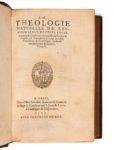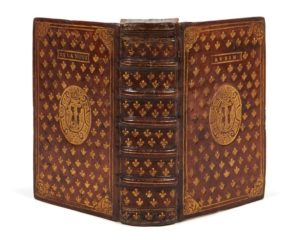 [Michel de MONTAIGNE]. Raymond SEBON[DE]. De La Théologie naturelle… en laquelle par l’ordre de Nature, est demonstrée la vérité de la Foy Chrestienne & Catholique, traduicte nouvellement en François. In-8, veau brun avec, sur les plats, semé de fleurs de lys, écoinçons, médaillon central représentant la Crucifixion et mention Aubin / de La Noue, dos à 5 nerfs avec semé de fleurs de lys, tranches dorées ( Reliure vers 1600). Brunet, V-10 // Cioranescu, 15353. (2f.)-496f.-(30f.) / [ ]2, b-z8, A-Z8, Aa-Rr8, s-v8, x6 / 105 x 168 mm. Édition originale de la traduction par Montaigne de la Théologie naturelle de Raymond de Sebonde. L’auteur, philosophe et théologien espagnol de la seconde moitié du XIVe siècle, enseignait les sciences à Toulouse vers 1430, ville où il s’éteignit en 1432. Il est l’auteur de plusieurs ouvrages, dont La Théologie naturelle dans laquelle il se propose d’establir et verifier contre les athéistes par raisons humaines et naturelles tous les articles de la religion chrestienne (Montaigne). Ce traité était fort prisé du père de Montaigne et c’est par affection filiale que le grand philosophe le traduisit. Cette traduction achevée, elle fut imprimée par la volonté expresse de son père. La traduction est précédée d’un sonnet de François d’Amboise. Bel exemplaire réglé, dans une reliure portant sur le premier plat le nom Aubin et sur le second De La Noue. L’exemplaire figure dans le catalogue Techener de 1858 (II-6977) et dans le bulletin n° 37 de la librairie Damascène Morgand (nov. 1895, n° 27141). Techener indique que la reliure aurait été faite pour Aubin de La Noue, probablement membre de l’illustre famille bretonne La Noue. Début de fente à une charnière, manque aux coiffes et une tache à un plat. Petit manque de papier aux feuillets A1 et Gg4, petits trous de vers atteignant les 20 derniers feuillets. Provenance: Aubin de La Noue (? supra libris).