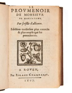 [Michel de MONTAIGNE. Marie de GOURNAY]. Le Proumenoir de Monsieur de Montaigne. Par sa fille d’alliance. Ediction troisiesme plus correcte & plus ample que les précédentes. In-16, demi-chagrin marron, dos lisse orné ( Reliure du XIXe siècle). Barbier, III-1096 // Brunet, II-1682 // Tchemerzine-Scheler, III-460. (5f.)-219-(1f. blanc manquant ici) / A-O8, P4 / 69 x 111 mm. Cinquième édition du Proumenoir de Monsieur de Montaigne. Marie de Gournay, née en 1565 et morte en 1645, est principalement connue aujourd’hui pour la relation intellectuelle qui l’unissait à Montaigne. Le Proumenoir parut la première fois en 1594 chez Abel L’Angelier, qui en donna rapidement deux autres éditions en 1595 et 1599. L’ouvrage avait également entre-temps paru à Chambéry chez Maurice Malicieu. Cette édition rouennaise de 1607 est donc la cinquième, en dépit de la mention troisième imprimée sur le titre. Elle contient le Proumenoir en prose, une traduction en français et en vers du second livre de l’ Énéide, un Bouquet poetique dédié à Léonor, fille de Montaigne et «sœur d’alliance» de l’auteur, et la préface aux Essais de 1595, que l’imprimeur, dans une note liminaire au lecteur, jugea bon d’ajouter à la fin pour ne la laisser perdre. Mouillure angulaire au cahier M.