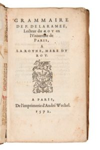 [Pierre RAMUS]. P. de LA RAMEE. Grammaire… In-8, vélin souple à recouvrements, dos lisse muet, …