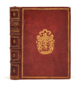 Geoffroy de VILLERHARDOUYN. L’Histoire de Geoffroy de Villehardouyn,… de la conqueste de Constantinople par les Barons François associez aux Venitiens, l’an 1204. d’un costé en son vieil langage ; & de l’autre en un plus moderne & intelligible par Blaise de Vigenère. In-4, maroquin rouge, roulette dentée dorée en encadrement et armes au centre des plats, dos à 4 nerfs orné ( Reliure du XVIIe siècle), boîte moderne. Brunet, V-1238 // Olivier, 1902-1 // Tchemerzine-Scheler, V-957. (14f.)-CLXXXVIf. / ã4, ē4, ī4, õ2, A-Z4, Aa-Zz4, AA2 / 150 x 210 mm. Édition originale de cette chronique de la prise de Constantinople en 1204. Geoffroy de Villehardouin, né vers 1155 près de Troyes et mort en Thessalie vers 1213, fut sénéchal de Champagne sous le comte Thibaut V. Enrôlé dans la quatrième croisade, il prit une grande part à la prise de Constantinople en 1204 et à la fondation de l’empire latin d’Orient. Témoin privilégié de ces événements, il s’en fit le chroniqueur: son intéressante Histoire de la conquête de Constantinople… est un des plus vieux monuments de la prose française (Larousse). Elle aurait paru sous une forme fragmentaire en 1573 à Venise, mais les bibliographes remettent en cause l’existence de cette édition et considèrent celle de 1585, la nôtre, comme l’originale. Cette édition offre le récit original en vieux français en regard de sa version moderne & intelligible donnée par Blaise de Vigenère. Exemplaire aux armes de François de Rignac, avec sa devise « Semper in altum». François de Rignac (1595-1660) fut en 1621 procureur général du Roi en la Cour des Aides de Montpellier. Bel exemplaire malgré le second plat taché. Mouillure angulaire plus ou moins prononcée à l’ensemble du volume, petite restauration angulaire à quelques feuillets et manque angulaire au dernier, soulignements et annotations anciens à l’encre, en particulier à 5 feuillets. Provenance: ex-libris partiellement effacé sur le titre et François de Rignac (armes et devise).