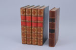 1/2 basane verte du temps pour les tomes I à IV ; 1/2 chagrin marron du temps pour le tome V. (Les dos des tomes I à IV sont insolés.)