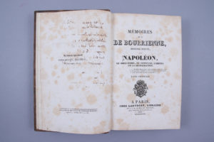 Bourrienne, condisciple et seul ami intime de Bonaparte à l'Ecole de Brienne, devient son secrétaire dès la campagne d'Italie d'avril 1797, jusqu' à 1802. Il est le rédacteur du Traité de Campo Formio, et le directeur de l'Imprimerie de l'Armée d'Egypte. Compromis en 1802 dans la faillite frauduleuse de ses amis les frères Coulon, tanneurs et fournisseurs des cuirs pour l'armée d'Italie, il est envoyé par Napoléon à Hambourg, pour surveiller l'application stricte du blocus continental ... Il en profite, en 1807, pour commander à des fournisseurs britanniques les manteaux des troupes française satationnées en Prusse... .Rappelé à Paris par l'Empereur en 1813, il se rallie aux Bourbons en 1814. Il est ruiné en 1830, à la chute de Charles X, et donne de nombreuses notes et cahiers à Villemarest, pour la rédaction de ses Mémoires. Il meurt en 1834 dans un asile d'aliénés.