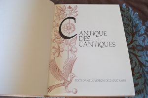 Prevzner (Agata) - Le Cantique des Cantiques. Illustrations de Prevzner. Michel de l'Ormeraie, 1977. in4 reliure éditeur en soie d' orient sous rhodoïd, non paginé, 37 illustrations en noir ou en 2 tons. Un des ex. sur centaure ivoire. Bel état.