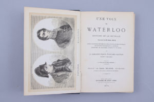 Percaline de l'éditeur, illustrée sur le premier plat d'un fer doré central dans lequel se lisent les noms de Wellington et de Waterloo ; sur le second plat un portrait en médaillon de George (V) Regent. Première édition -et seule édition ancienne- illustrée de 12 planches et cartes hors-texte, de la traduction de "The voice from Waterloo", de l'anglais Edward Cotton, qui participa à la bataille avant de fonder le Musée de Waterloo, et de s'en faire le guide.