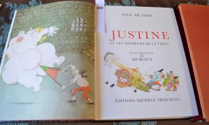Sade (Marquis de) & Dubout (Albert) - Justine ou les malheurs de la vertu. 76 illustrations en couleurs de Dubout (compositions in- et h. t., certaines sur double page). Michèle Trinckvel, 1976. in4, simili-cuir noir d'éditeur, dos orné de motifs...