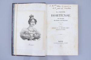 Envoi manuscrit de la Reine Hortense à sa cousine Elisa de Perrigny. (Tulard, 707 : "Au cours de son récit la reine Hortense revient sur les événements de 1814 et 1815 et les conditions de son exil en Suisse.")