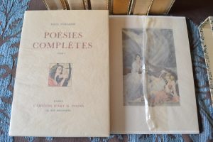 Verlaine (Paul) - Poésies complètes. Illustrations en couleurs de William Fel. Piazza, Paris,1938. 7 volumes in8, brochés, sous emboitages Un des 30 ex. de tête sur Japon contenant une suite en couleurs et une suite en noir. Très bons exemplaires.