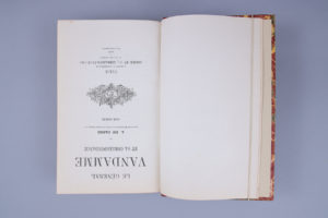 1/2 maroquin cerise. (Salissure loin du texte dans la marge de la page 9 du tome II. Mouillure claire et saine dans la marge de queue des pages 473 à 476 du tome II)