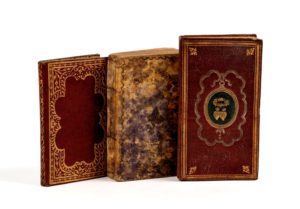 gardes de papier dominoté doré, tranches dorées (Rel. ép.). Joints : - Les tablettes de l'amour et de Vénus à Guide. Paris, Esnauts, et Rapilly (1790). In-32, 50 x 94 mm, maroquin bordeaux, plaque dorée en encadrement, dos lisse orné, gardes de papier dominoté, tranches dorées (Rel. ép.). 12 gravures. Petites mouillures, taches et galeries de vers ; manque angulaire à une gravure, qq traces d'un crayon enfantin. - Calender 1787. [Goettingue], J. C. Dietrich. In-24, cartonnage souple papier marbré. Frontispice, 22 planches de coiffures féminines et masculines, certaines signées Riepenhausen, 12 gravures de scènes de "Die Lustigen Weiber zu Windsor", la première signée Chodowiecki, 12 planches gravées par Riepenhausen d'après les caricatures de William Hogarth. Taches et salissures.