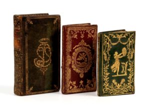 décor faisant allusion à la naissance du Dauphin de France à Versailles le 22 octobre 1781 (- 4 juin 1789). Joint : - Cadeau des Muses, ou almanach universel. Falaise, Brée frères, 1811. In-24, maroquin vert, encadrement doré, fer doré à la joueuse de tambour au centre des plats, dos lisse orné, gardes de papier dominoté doré, tranches dorées (Rel. ép.). 2 planches dépliantes (mappemonde, France). Corps de l'ouvrage détaché. - Les spectacles de Paris. Paris, veuve Duchesne, 1789. In-24, maroquin vert, encadrement doré de filets, chiffre doré couronné S. S. D., dos lisse orné, tranches dorées (Rel. ép.). Ex-libris bibliothèque de La Hamonais. Ex-libris manuscrit Dumont de Monteurs.