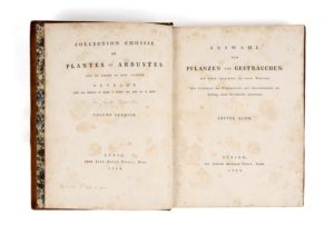 botaniste suisse Joseph-Philippe de Clairville (1742-1830). Collectionneur de plantes et de papillons, français émigré en Suisse, il publia aussi une Entomologie helvétique. Le texte, en français et en allemand, est illustré de 27 planches de plantes et fleurs en couleurs. Tome Ier et seul paru. Sur le faux-titre, envoi au crayon de l'auteur signé "Cl…" à son "amico carissimo" M. de Gillaboz, collectionneur de Franche-Comté. Rousseurs. Reliure frottée, avec petits trous de vers. Biblographie : Ex-libris armorié Bibliothèque M. de Gillaboz (Fideli obsequio).