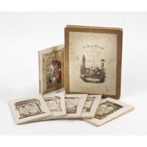 compartiments, richement décorée par une bordure gaufrée or et une lithographie coloriée. Édition originale. Chaque volume est illustré d'une lithographie coloriée sur la couverture et une hors texte, par Gabriel Montaut?. 4 planches gravées de musique. Infimes rousseurs. Tome V, dos fendu. Boite lég. frottée et cassée, sans manque, salie. Bel exemplaire, conservé dans sa boite d'origine, condition rare pour ces fragiles livres d'enfants de l'époque romantique. Joint : Petite galerie d'histoire naturelle. Les Oiseaux. - Les Fleurs. - Les Fruits. Imprimerie de Maulde et Renou, s.d. (vers 1830). - 3 vol. in-24 (sur 4), cartonnage illustré de l'éditeur, 52 x 80 mm, chacun illustré de 2 planches en couleurs, réunis dans une boîte lithographiée en couleurs. Sans Les Papillons.