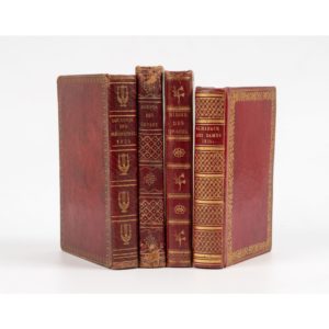 tranches dorées (Rel. ép.). 4 figures de mode en couleurs, dont une en frontispice. Joints 3 volumes, en reliures proches : - Almanach des dames. Tübingen, Cotta ; Paris Xhrouet, 1810. Titre et 8 planches gravés. Rousseurs, une déchirure sans manque. - FRÉVILLE. Agenda des enfants. Paris, Eymery, 1816. Titre et frontispice gravés. Rousseurs. - Le Souvenir des ménestrels contenant une collection de romances inédites ou nouvelles. Paris, au magasin de musique de la Lyre moderne, s.d. (1825). Recueil de chansons avec musique notée, illustré d'un titre et 6 figures gravés en noir. Rousseurs.