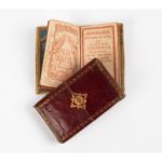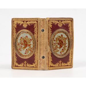 sur les plats, large pièce de maroquin rouge rapportée, ornée de palmes dorées, au centre de chaque plat, médaillon sous verre orné d'un oiseau de paradis constitué de paillons or et rouge, dos lisse orné, têtes d'agrafes, au premier contreplat miroir (tain abîmé) serti d'un galon doré, soufflet de soie bleue au second contreplat, gardes de soie rose doublées de papier doré, tranches dorées, étui de maroquin rouge doublé de soie bleue (Rel. ép.). Imprimé en rose, cet almanach est orné d'un frontispice gravé et in fine, un feuillet de musique dépliant. Au coeur du volume, calendrier 1791 imprimé en noir. RARE DÉCOR ET RELIURE EN PARFAIT ÉTAT Bibliographie : Grand-Carteret : 437 (publié à partir de 1771).