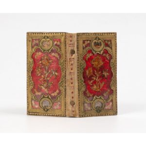 motifs floraux dorés, sous mica, dos lisse orné, têtes d'agrafes, au premier contreplat miroir (tain abîmé) serti d'un galon doré, soufflet de soie rose au second contreplat, gardes de papier doré gaufré, tranches dorées (Rel. ép.). RAVISSANT SPECIMEN EN BEL ÉTAT.