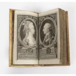 RELIURE À DÉCOR DORÉ SOUS MICA. - Almanach de Normandie. Rouen, Besogne, 1786. In-24, 52 x 104 mm, cuir ivoire, sur les plats, large cadre évidé de cuir vert, orné de motifs dorés, collé sur un fond de papier métallisé rouge rehaussé de...