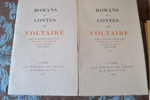 Voltaire - Romans et contes. Paris, Horizons de France, 1934. 2 vol. in8 brochés, sous emboitage (endommagé) VI, 356 pp., 401 pp. gravures de Moreau le Jeune. Exemplaires non coupés. Un des 100 ex. sur Vergé de Hollande avec deux suites en noir....