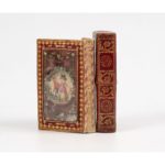 RELIURE À DÉCOR PEINT SOUS MICA. - Étrennes mignonnes, curieuses et utiles. Paris, Guillot, 1780. In-24, 56 x 91 mm, cuir ivoire, sur les plats, cadre de maroquin bordeaux mosaïqué orné d'une roulette dorée : sur un fond de papier métallisé...