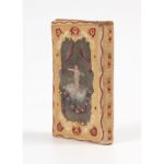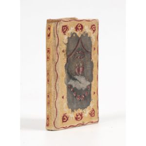 blanches, au centre des plats deux peintures sur fond gris : deux coeurs d'amour flottant au-dessus d'un nuage au premier plat, un Cupidon armant son arc, debout sur un nuage, au second plat ; papier dominoté, tranches dorées (Rel. ép.). Almanach contenant un calendrier en deux volets dépliants (pliures), 24 ff. gravés et un cahier imprimé au milieu du volume. Titre orné de petits Amours jouant sur un pont et 12 figures finement gravés. PLAISANT SPÉCIMEN DE MINIATURES SUR CUIR. Salissures au titre et figures, rousseurs, annotations. Petits frottements. Bibliographie : Pas répertorié dans : Grand-Carteret .