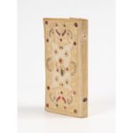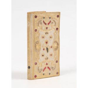 RELIURE À PLAQUE DORÉE. - Calendrier de la Cour. Paris, Hérissant, 1765. In-24, 52 x 104 mm, maroquin ivoire, plaque dorée évidée laissant apparaître des fonds de papiers métallisés rouge, argent et bleu, doublure et gardes de soie bleue,...