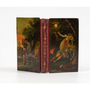 son chevalier et deux amis pleurant sur une tombe ; au premier contreplat miroir (cassé, et tain abîmé) serti d'un galon doré, soufflet au second contreplat, tranches dorées (Rel. ép.). Titre et 13 planches gravées, aquarellées. Calendrier 1809 en deux volets dépliants. JOLI DÉCOR VERNI, dans le style du vernis Martin breveté par Bertin en 1811, dont les sujets sont bien en lien avec le thème de ce petit volume. Craquelures superficielles, quelques petits éclats. Garde sup. tachée, frottée.