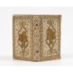 RELIURE BRODÉE. - L'Amour victorieux ou Les Conquêtes de Cypris. Almanach chantant. Paris, Veuve Depoilly, (1785). In-24, 56 x 93 mm, 24 pp., soie ivoire brodée de fils métalliques dorés et fils verts, perles dorées, motif d'un bouquet de blé...